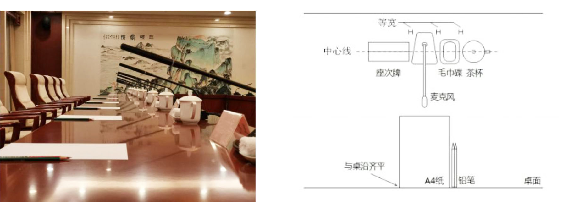 5.2.3.4.2桌面物品擺放應(yīng)橫平豎直、整齊劃一。座牌位置、杯墊位置、茶杯方向、紙筆位置等均應(yīng)統(tǒng)一。毛巾縫朝右擺放。會(huì)議資料放置于座位對(duì)應(yīng)桌面居中位置,筆放置于會(huì)議資料右邊。